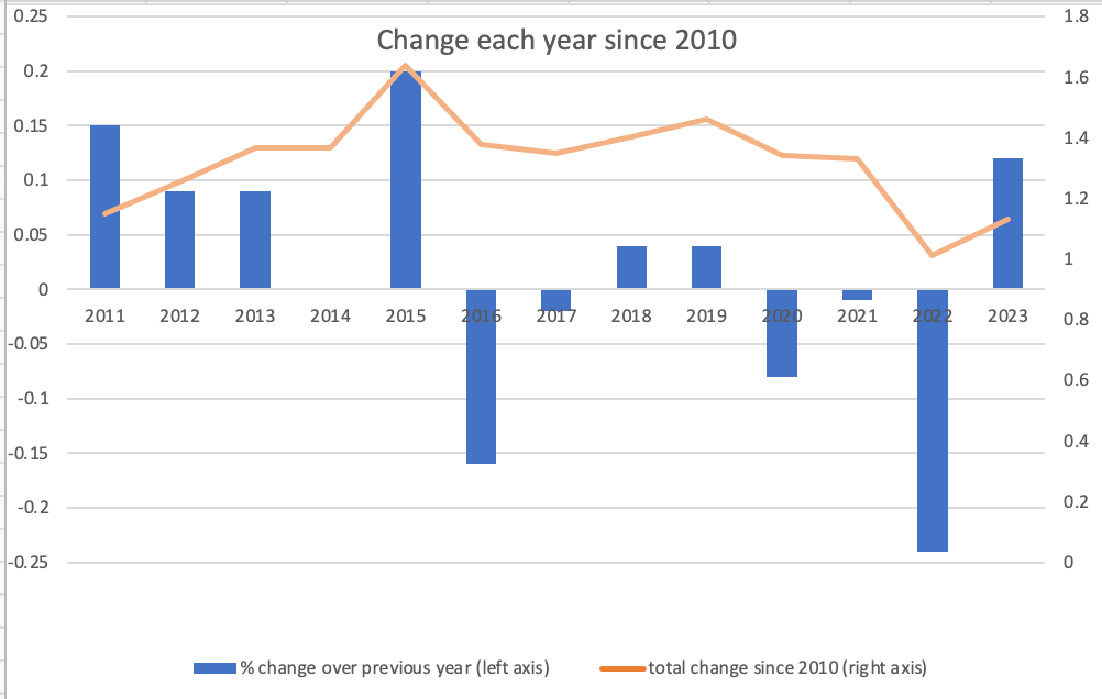 While the impact of Covid can be inferred from the graph, it is noteworthy that the first five years of the past decade saw increases every year except 2014, whereas numbers plateaued at a lower level in the last four years of that decade.