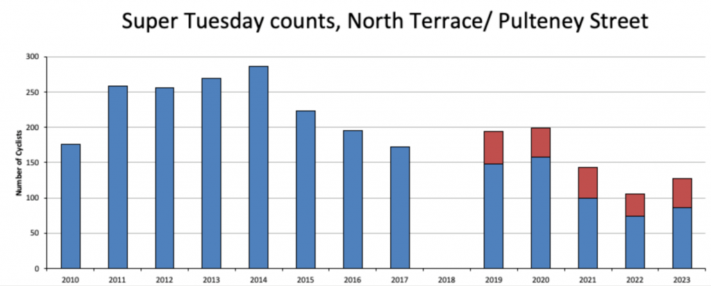 The Super Tuesday counts have traditionally been designed to measure commuting by cycling to the CBD and so are very sensitive to activity levels in the CBD. The 2020 count was undertaken at a time when there was general concern about the spread of the pandemic into Australia, but no formal restrictions on activities. The 2021 count was undertaken at a time when SA’s isolation from other states and Australia’s isolation from the world enabled us to live reasonably normal lives, although many had taken to working from home or attending classes virtually, especially if they were overseas students. The 2022 count occurred a few months after SA was opened up to the rest of the world, the number of Covid infections was surging, and the State government had a policy of requiring close contacts of those infected to also isolate. There were also work-from-home mandates (such as a limit of 50% on the proportion of public servants allowed to work in the office) and the strengthening of social distancing requirements in offices and at public venues. It is not surprising that the numbers saw a decline of 24% – by far the biggest fall recorded in over a decade of counting.
