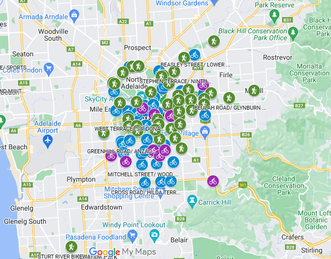 This year we had a very good response to the call for volunteers, thanks to BikeSA helping us with recruitment. 83 locations were counted, 26 more higher than the previous record of 57, recorded in 2022. (Counts were also undertaken by the Bicycle Network, in the Cities of Holdfast Bay and Port Adelaide Enfield.)